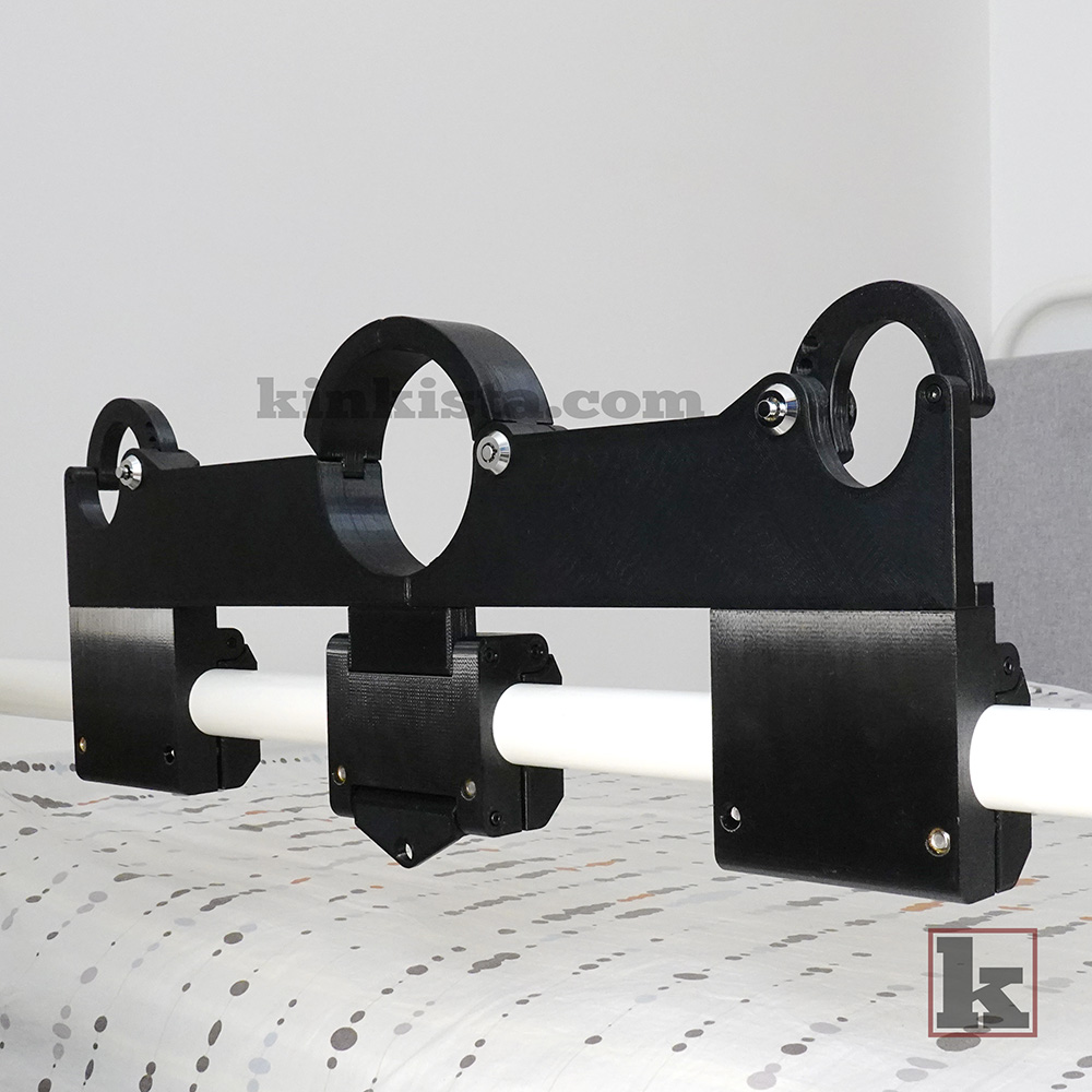 Based on their requirements and measurements, a working prototype came together quickly. The core of the design is a set of three pinch clamps that grip the pipe at the foot of the bed. Each is secured with two 3/8″ screws; installation is straightforward—wrap the clamp around the pipe and tighten the screws with an Allen key. No special tools or technical skills are needed, and the whole process takes under 3–5 minutes. Each clamp provides over 50 lb / 22 kg of clamping force, for a total of 150 lb / 66 kg.