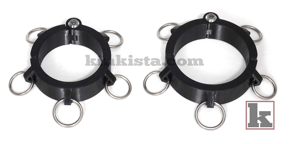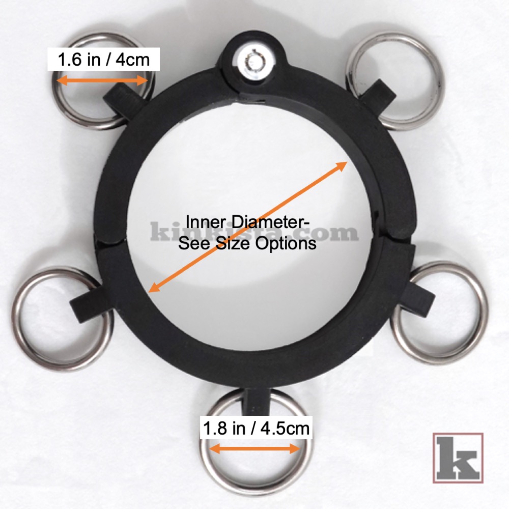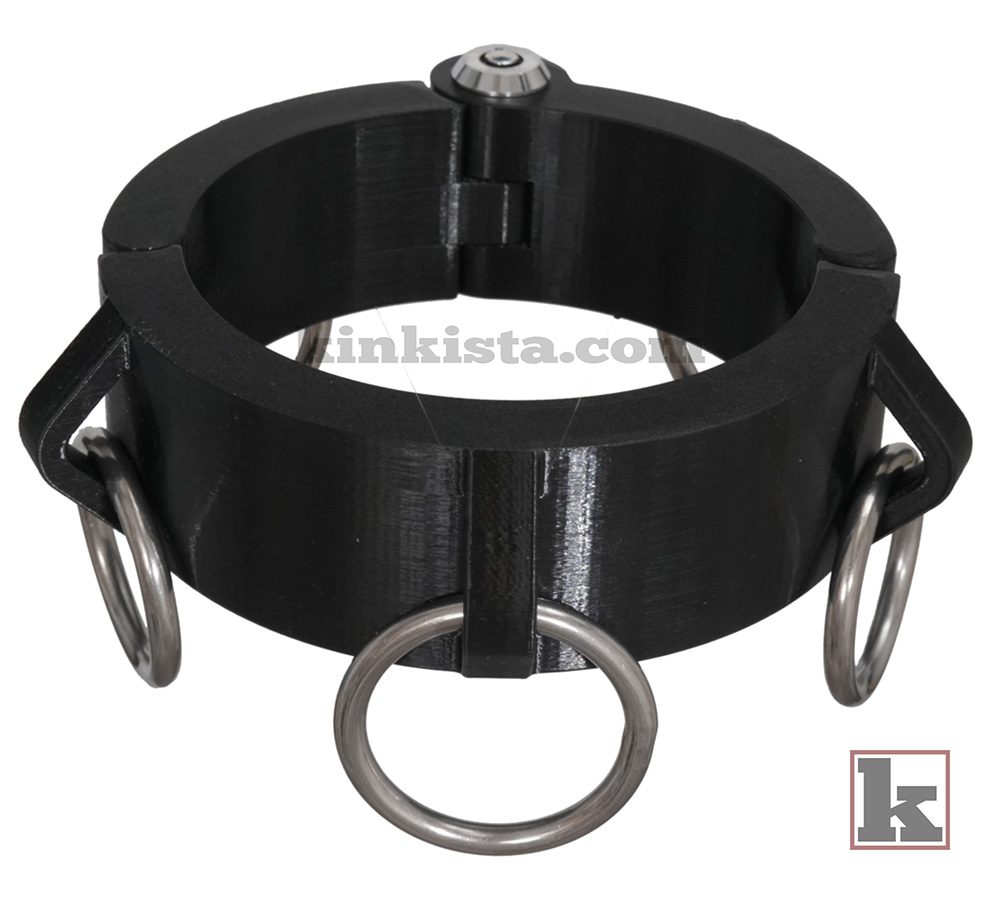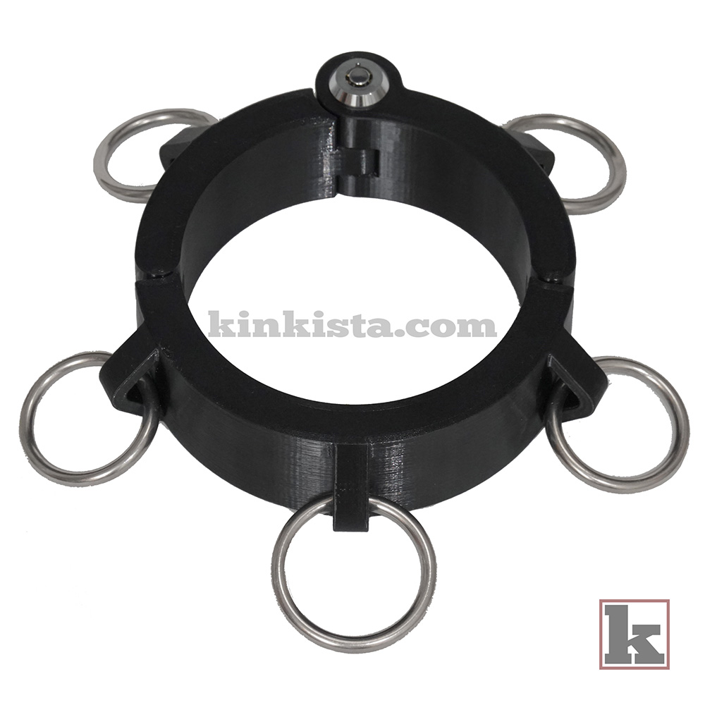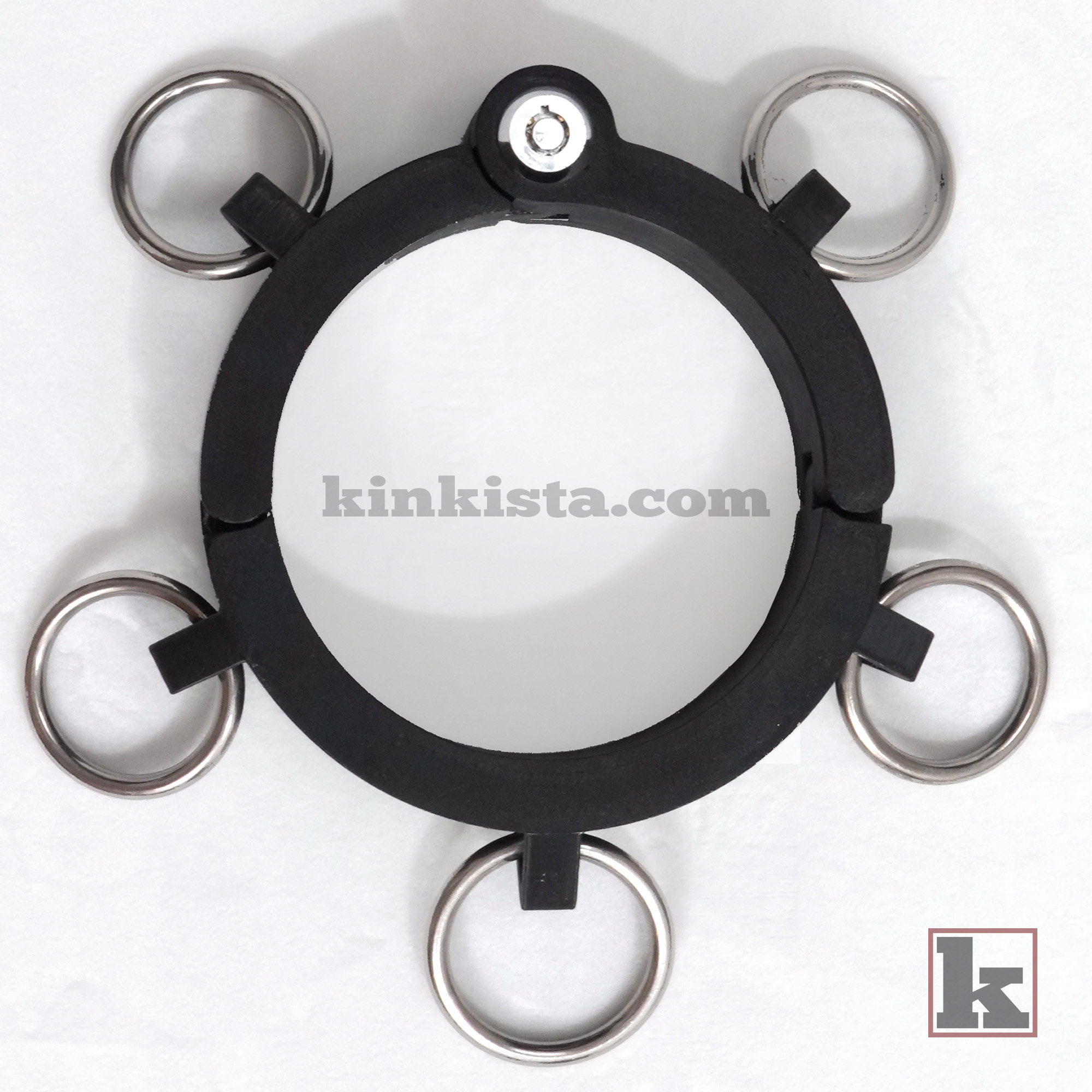 The Five-Ring Collar is built for players who want more than a single anchor point. With one large center O-ring and four smaller rings spaced around the collar, it transforms instantly from a simple restraint into a multifunction bondage hub.