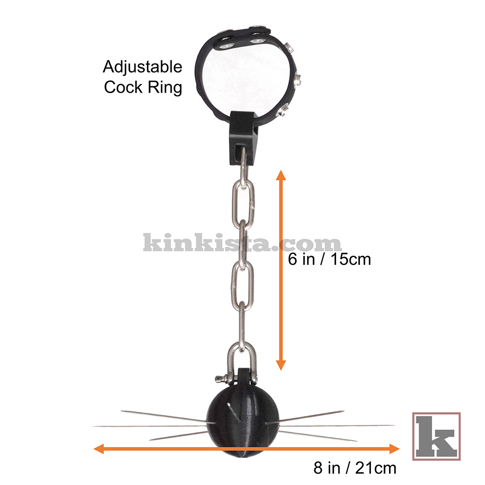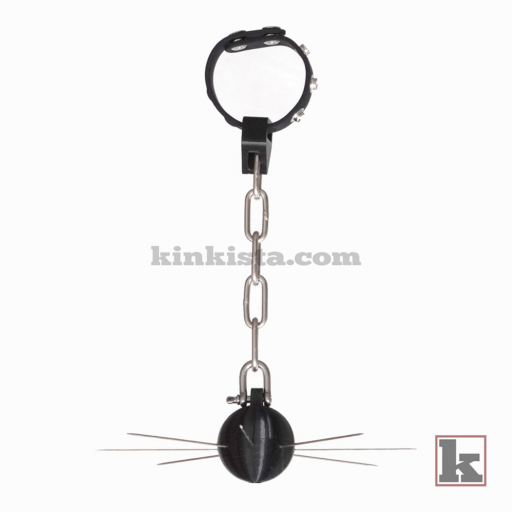 Unlike a separate bar, a cock ring anchors the device from the root, while a star-shaped spiked ball hangs between his thighs. Any attempt to draw his legs together meets a sharp reminder, compelling him to stay spread and exposed. Stillness helps; closing brings punishment.